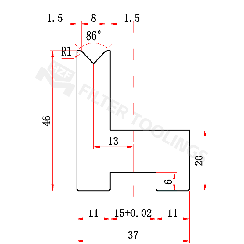 The Standard Lower Die features meticulously calibrated dimensions to ensure optimal bending performance: key parameters include 1.5mm, 8mm, 13mm, 20mm, and 37mm, with critical tolerances such as 15+0.02mm for precise alignment with press brake systems. The die integrates an 86° angle and R1 radius design, which minimizes material springback and ensures uniform bend formation. Every dimension is verified through rigorous quality control to guarantee seamless integration with existing production lines.