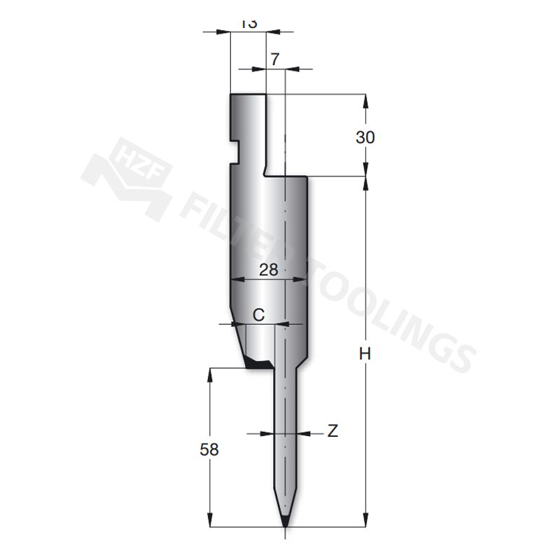 Deep Insert Punches have optimized dimensional parameters to ensure compatibility with most press brakes. Key dimensions include: 13mm tool thickness, 7mm groove depth for material positioning, 30mm effective working length, 28mm installation height, C-type positioning slot for quick calibration, H-type reinforcement structure to prevent deformation, -Z direction marking for accurate assembly, and 58mm total length. These standardized dimensions not only simplify the installation process but also ensure consistent punching accuracy across different batches of products.