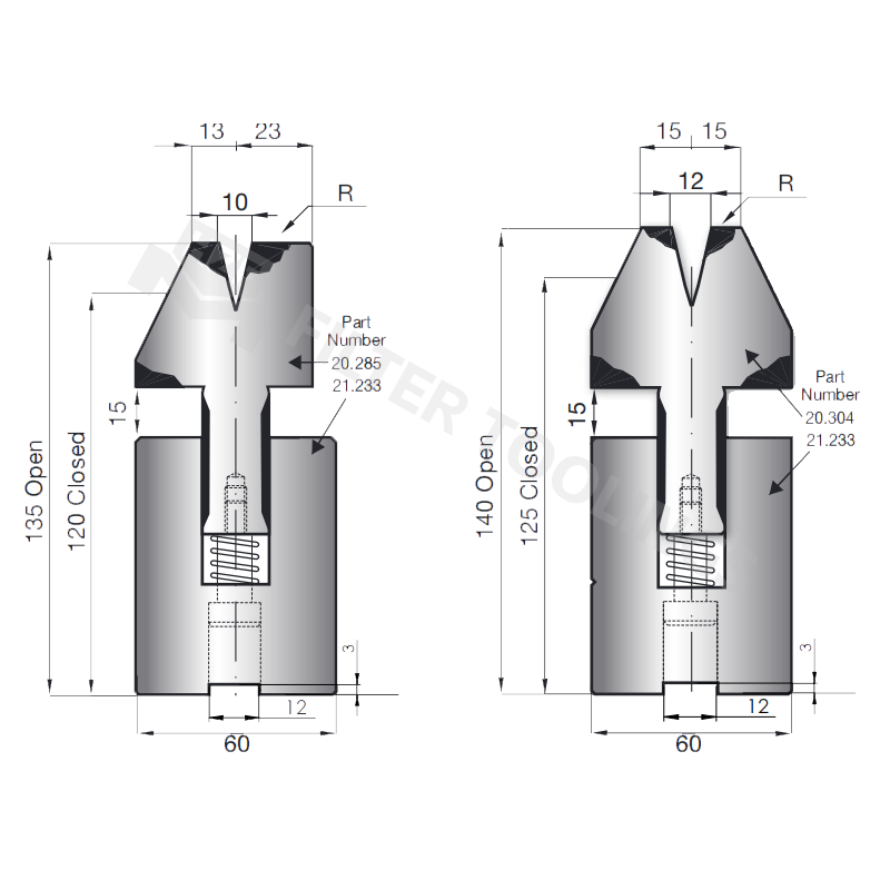 Our spring assisted flattening dies feature meticulously calibrated dimensions—including 13mm, 23mm, 15mm, 10R, 12R, 20.285mm, 21.233mm, and 20.304mm—to ensure a perfect fit with most press brake models. The precise tolerances guarantee alignment accuracy, which is essential for achieving consistent hemming and flattening results. Every die is inspected for dimensional accuracy before leaving our facility.
