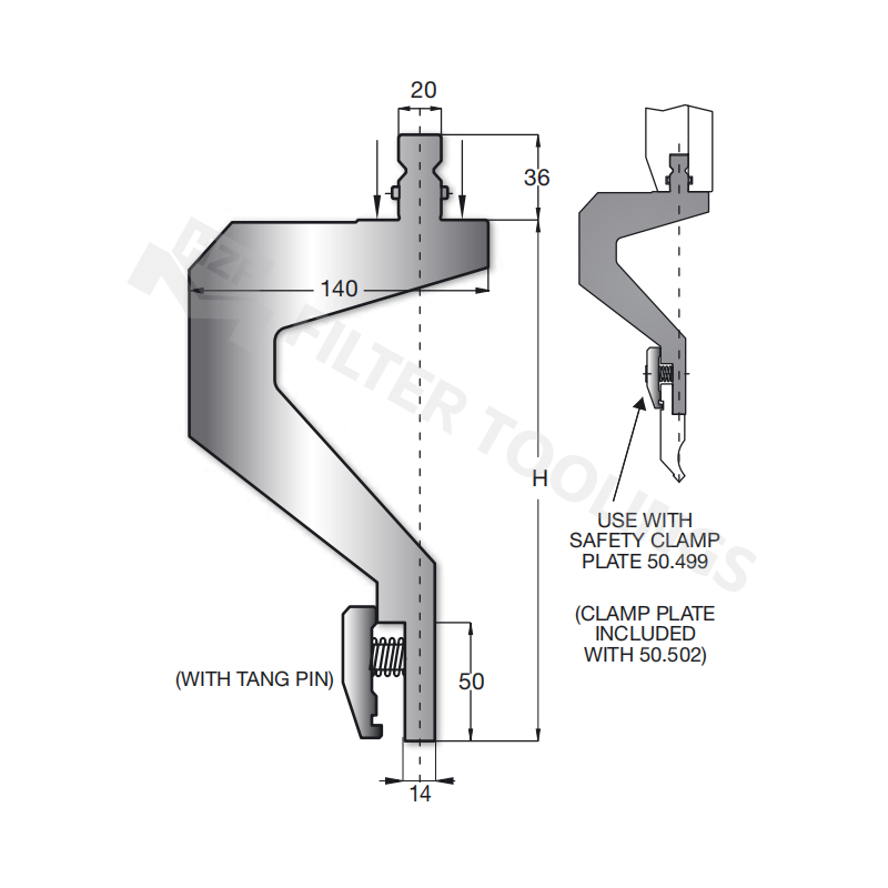 TRUMPF Style Tooling European Style Tooling adopts European standard dimensions, with key parameters including: 20mm tool width (consistent with TRUMPF’s original tool specifications), 1mm precision tolerance (ensuring no installation gaps), 140mm effective working stroke (adapting to large-depth bending). The most prominent feature is the integrated SAFETY CLAMP, which is matched with PLATE 50.499 (clamp base plate) and CLAMP PLATE WITH TANG PIN (0000 000 50); PLATE 50.502 is also included to enhance the stability of the clamp, preventing tool displacement during high-pressure processing.